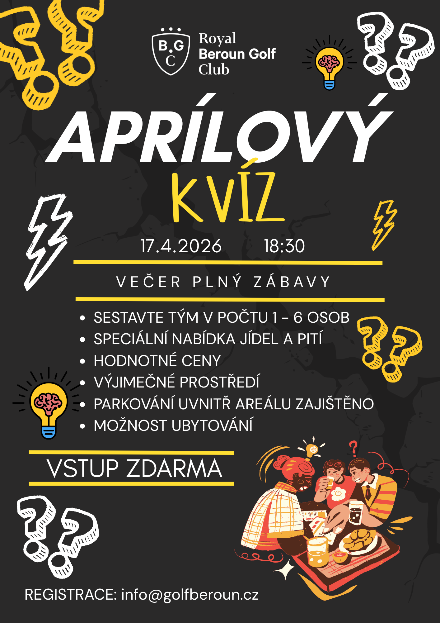 Kvíz se bude konat v pátek 17.04.2026 od 18.30hod. Vstup je ZDARMA a můžete složit tým z přátel, kolegů nebo rodiny. Stačí si jen udělat rezervaci na daný večer na: info@golfberoun.cz. Parkování uvnitř areálu budete mít zajištěné.