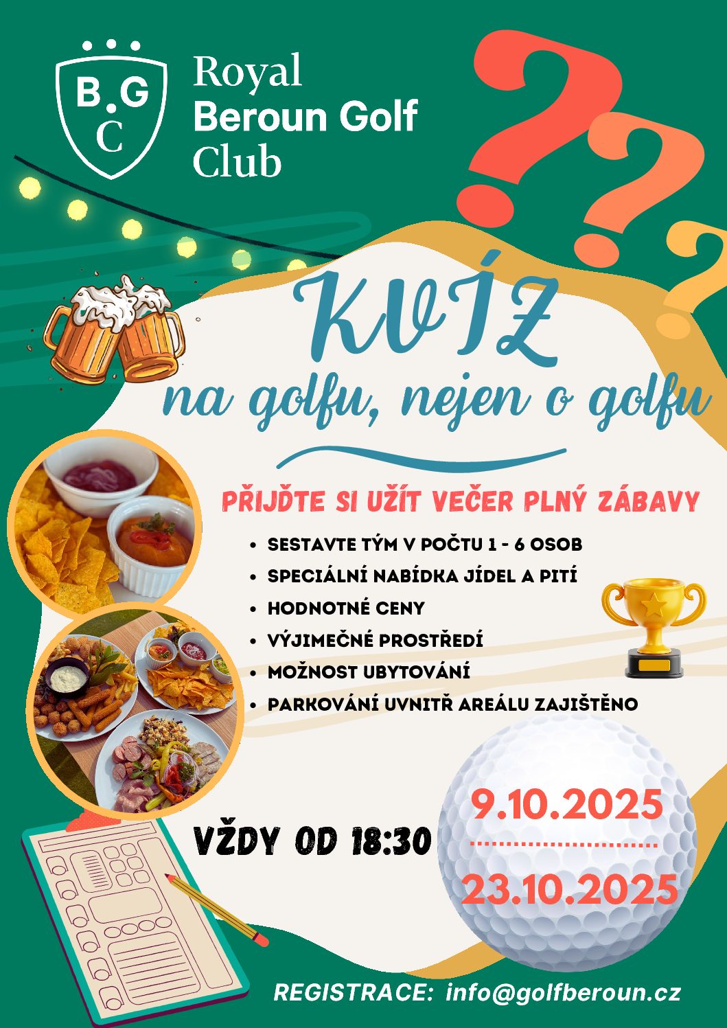 Zveme Vás na kvízové večery! V průběhu října budeme pořádat 2 kvízové večery. Vstup je ZDARMA a můžete složit tým z přátel, kolegů nebo rodiny. Stačí si jen udělat rezervaci na daný večer na: info@golfberoun.cz. Parkování uvnitř areálu budete mít zajištěné. V průběhu večera budeme podávat i speciální nabídku, která se skvěle hodí ke kvízovému...